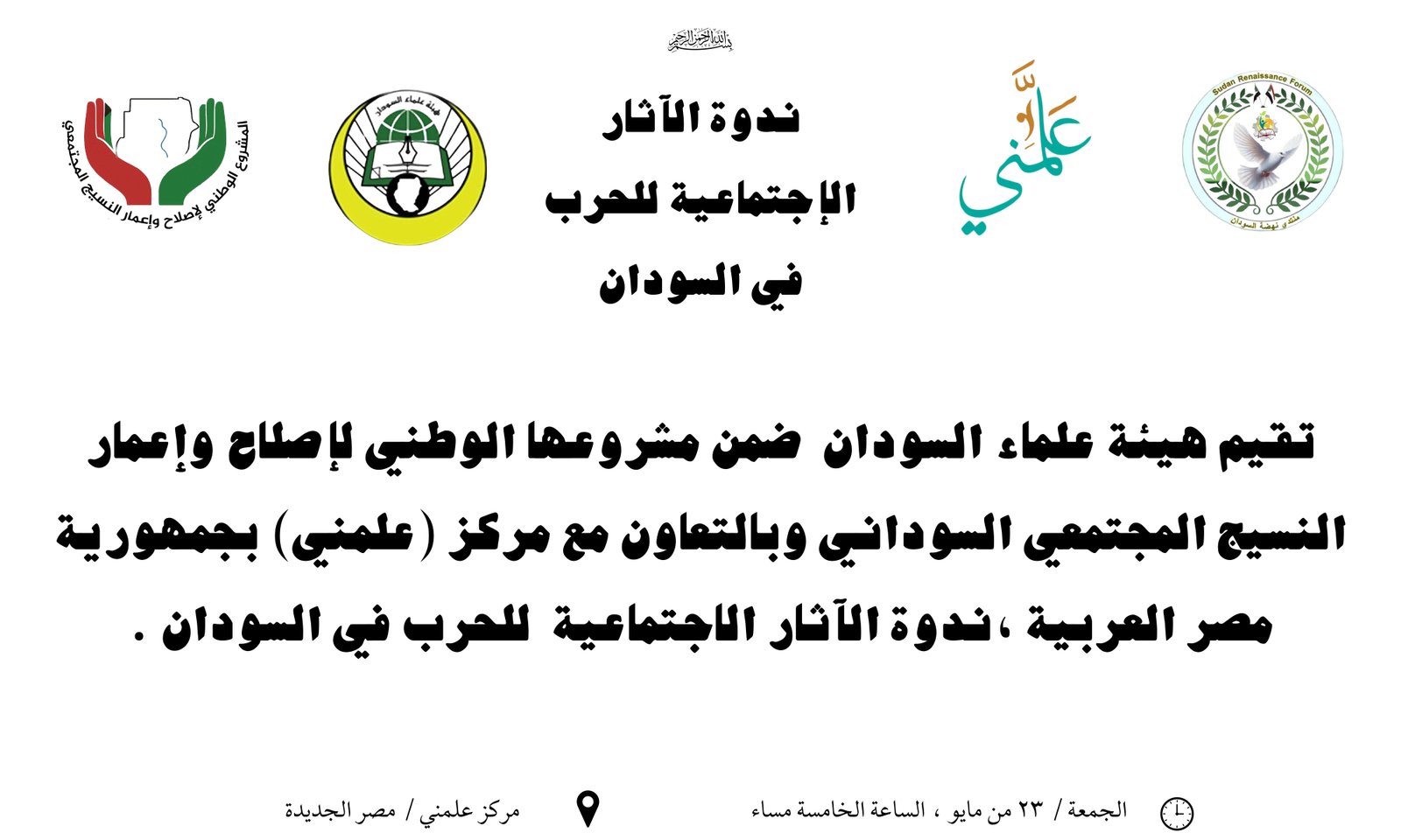 ضمن مشروعها الوطني لإصلاح وإعمار النسيج المجتمعي السوداني وبالتعاون مع مركز (علمني) بجمهورية مصر العربية تنظم هئية علماء السودان ندوة الآثار الاجتماعية للحرب في السودان وذلك يوم غد الجمعة 23 مايو 2025 الخامسة مساءً بمركز علمني بمصر الجديدة