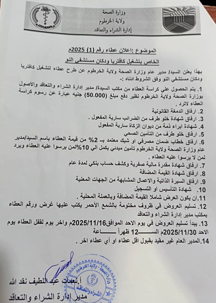 وزارة الصحة ولاية الخرطوم إدارة الشراء والتعاقد اعلان عطاء رقم (1) 2025م الخاص بتشغيل كافتريا ودكان مستشفي النو