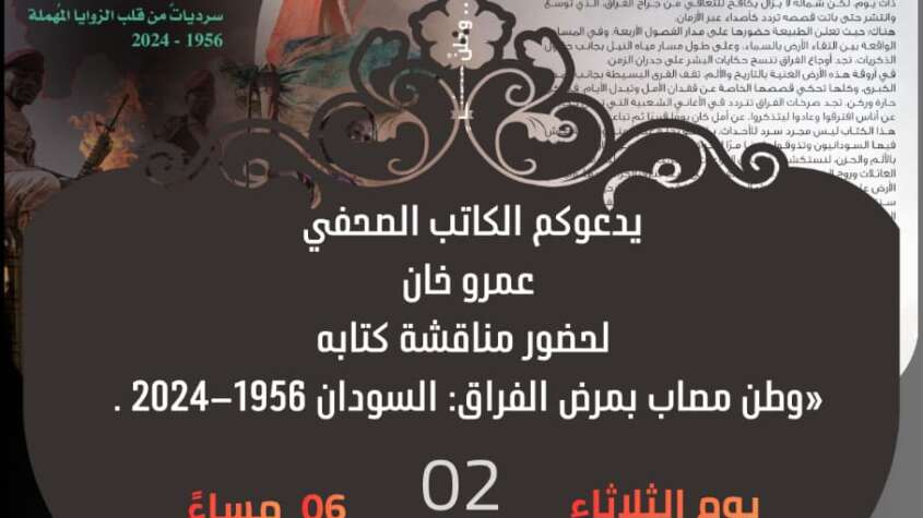 تستضيف نقابة الصحفيين المصريين يوم الثلاثاء القادم الموافق الثاني من ديسمبر المقبل لقاء مهم يناقش فيه الكاتب الصحفي عمرو خان كتابه الجديد وطن مصاب بمرض الفراق.. السودان 1956–2024م، وذلك في تمام الساعة السادسة مساء بقاعة هيكل.