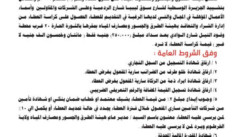 تعلن هيئة الطرق والجسور ومصارف المياه عن طرح عطاء رقم (٢) للعام ٢٠٢٦م والخاص بتشييد الجزيرة الوسطية لشارع سوق ليبيا شارع الردمية وعلى الشركات والمقاولين وأسماء الأعمال المؤهلة في المجال والتي لديها الرغبة في التقديم للعطاء الحصول على كراسة العطاء من إدارة الشراء والتعاقد بهيئة الطرق والجسور ومصارف المياه بمقرها بالثورة الحارة ٢٠ غرب محطة وقود النيل شارع الوادي بعد سداد مبلغ (٢٥٠،٠٠٠) جنيه فقط ( مائتان وخمسون الف جنيه لا غير ) قيمة كراسة العطاء لا ترد . وفق الشروط العامة :