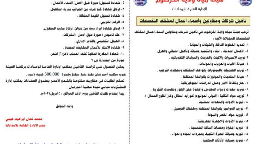 هيئة مياه ولاية الخرطوم ..تأهيل شركات ومقاولين وأسماء أعمال لمختلف التخصصات