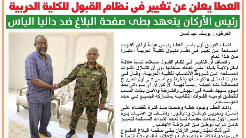 كشف الفريق أول ياسر العطا رئيس هيئة أركان القوات المسلحة عن تغيير فى نظام القبول للكلية الحربية اعتباراً من هذا العام،واضاف أن التغيير في نظام القبول سيعتمد نسباً عادلة لكل ولاية بناءّا على تعداد سكانها دون أن تتنازل القوات المسلحة عن شروط الانتساب للكلية الحربية، وقال في حديث لممثل “الكرامة” بالخرطوم أمس فى أول تصريح للصحافة منذ تعيينه رئيساً لهيئة الأركان إن أي سوداني بعد اليوم سيجد نفسه في الجيش والشرطة والأمن بذات النسب لتتحقّق قومية القوات النظامية بمشاركة الجميع في هذه المؤسسات.