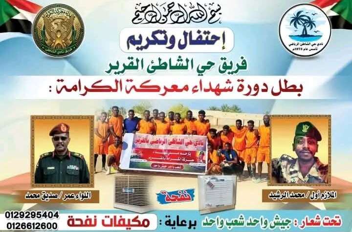 نظمت اسرة نادئ الشاطئ كرنفالا من الطرب وبرعاية كريمة من مكيفات نفحة لطلال عثمان وهى تتوج بطلا لدوره شهداء الكرامة والتى نظمها نادي القلعة تخليدا لذكرى الشهيد الفريق عمر صديق والشهيد الرائد محمد الرشيد وقدم فقرات هذا الكرنفال البهى. الشاعر الجميل الفاتح ابراهيم بشير بلغة شاعرية تمثلت فى الشعار المحبب لجماهير القرير جيش واحد وشعب واحد ومابين إنتهاء دوره شهداء معركة الكرامة والتى نظمها نادي الاخلاص بالقلعة تخليدا للشهداء ومنذ انطلاقة الدورة خرج فريق القلعه البلد المننظم للدورة على يد غريمه التاريخى نادئ الشاطئ والمباريات التى يكون لها طعم خاص هى عندما تواجه القلعة الشاطئ أو يواجه العامراب قوز قرافى ومنذ السبعينات نشأ تحالف ثنائي يجمع دوما العامراب والشاطئ بجماهيرها وفى الضفة الأخرى يقف جمهور القوز والقلعة وفى بداية الاحتفال ترحم الفاتح ابراهيم بشير على لاعب الشاطئ الاسبق الراحل عبود تبورى وحيا من على البعد لاعب قوز قرافي الفنان جعفر المنصورى وشرف هذا الاحتفال البهيج ممثل الفرقة التاسعة عشر ومدير شرطة القرير سعادتو عادل ضيوف كرام من أندية حسين نارتى يقودها عزت عبدالحفيظ عاشق القريرومساوى واوسلى والصفا وقوز هندى وقوز قررافى والعامراب والقلعة والكرى وسط حضور من أعيان القريروشرفها حضورا الفنان القدال والشاعر العطا علي العطا والسلطان حافظ الباساوالفنان خالد جبريل ومن أهلنا بالشاطى الأساتذة عادل عثمان وعبدالقيوم الشريفي ومحمد المهدي حامد