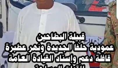 فى إطار دعم قبيلة البطاحين المتواصل للقوات المسلحة سيرت اليوم عمودية البطاحين بحلفا الجديده ونهر عطبره قافلة دعم واسنان للقيادة العامة بالخرطوم تحت شعار جيش واحد شعب واحد..حيث اكد عمدة البطاحين بحلفا الجديده ونهر عطبره بله على محمد أن دعمهم اليوم ياتى امتدادا لقوافل البطاحين المساندة والداعمة للقوات المسلحة والتى…